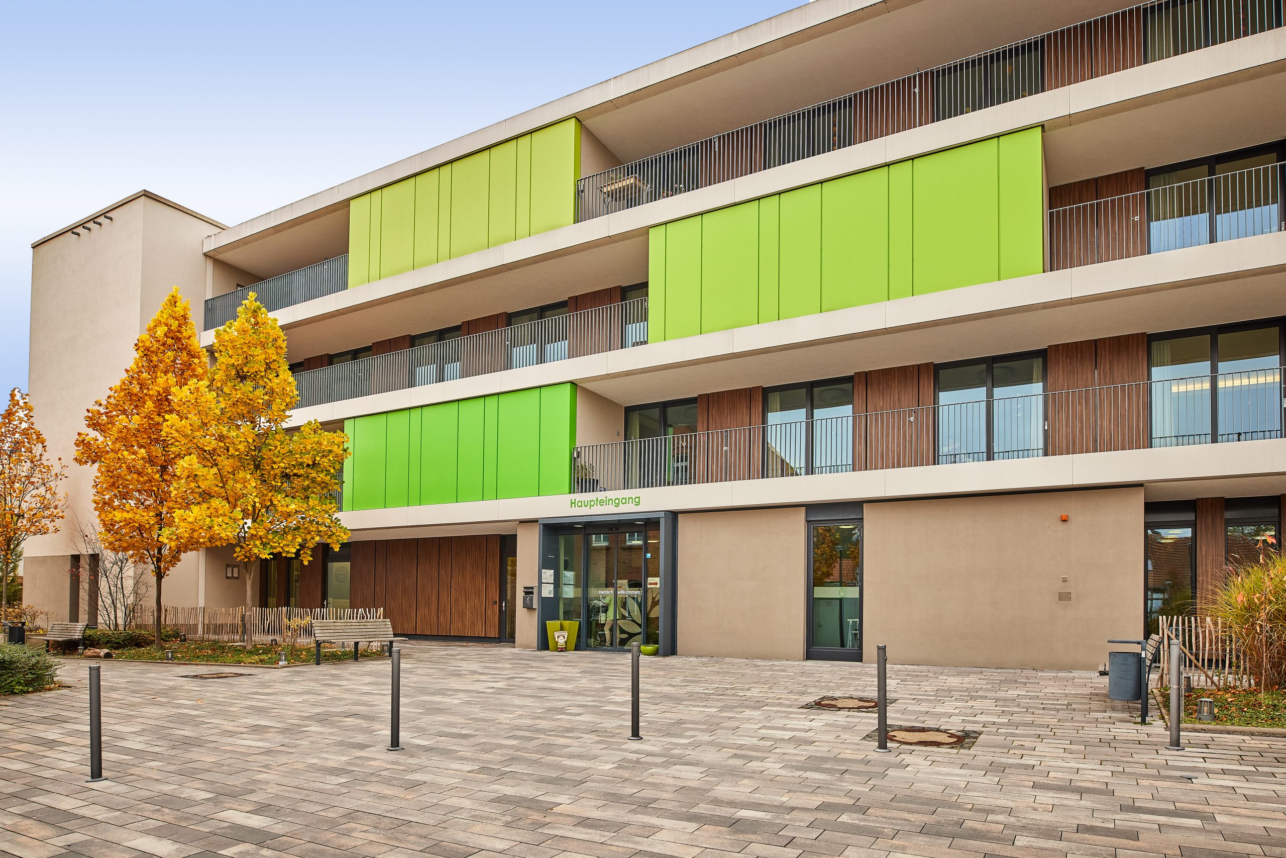 Die Pflegezimmer sind großzügig, barrierefrei und verfügen über eine eigene Nasszelle. Einige bieten Balkon oder Terrassenzugang. Zur Ausstattung gehören hochwertige Möbel und ein elektrisches Pflegebett.